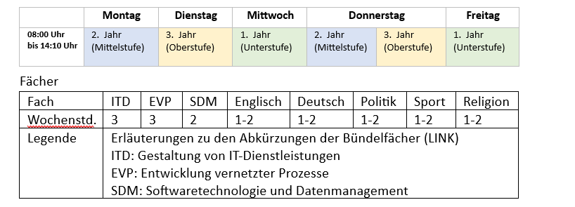 - Grundsätzlich arbeiten wir in allen IT-Klassen nach dem BYOD-Prinzip (Bring your own Device). Dabei setzen wir eigenes Equipment, auch gerne durch die Betriebe gestellt, voraus.