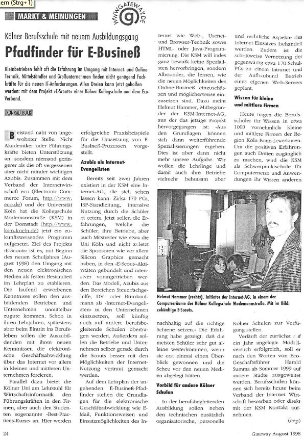 1998 entstand das Projekt „E-Scouts“ in Kooperation mit dem Eco-Verband. Der Eco-Verband der deutschen Internetwirtschaft ist mit rund 800 Mitgliedsunternehmen mittlerweile der größte Verband der Internetwirtschaft in Europa. Die Schüler der Internet AGs des EGB gaben Kurse in dem Basiswissen im Umgang mit elektronischer Geschäftsabwicklung vermittelt wurde (Anlage5). Unterrichtet wurden interessierte Schüler und Lehrer des EGB sowie auch anderer Schulen.