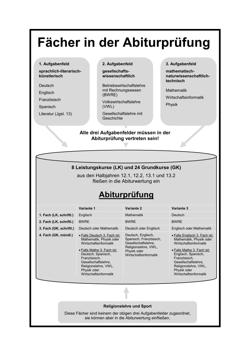 Die Abiturprüfung findet am Ende der Jahrgangsstufe 13 in vier Fächern statt: in Ihren beiden Leistungskursen und in einem dritten und vierten Fach, das Sie jeweils zu Beginn der Jahrgangsstufe 13 festlegen. Das dritte Fach, das wie die Leistungskurse schriftlich geprüft wird, muss entweder Deutsch, Englisch oder Mathematik sein. Das vierte Fach wird nur mündlich geprüft. Die schriftlichen Abiturprüfungen (1. - 3. Fach) werden zentral gestellt (Zentralabitur).