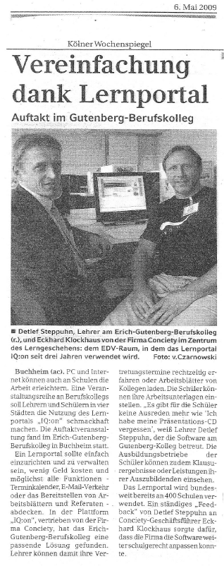 Im Jahr 2006 entschied sich das EGB für den Einsatz eines Lernportals. In Kooperation mit Microsoft wählte man das Produkt IQon als Plattform aus und entwickelte in Zusammenarbeit mit dem Unternehmen Conciety – dem Hersteller von IQon - das erste im Einsatz befindliche Lernportal an einer Kölner Schule (Anlage11). Der Begriff Portal wurde innerhalb des EGB mehrfach zum Wort des Jahres gekürt – insbesondere auf den jährlich stattfindenden Weihnachtsfeiern!