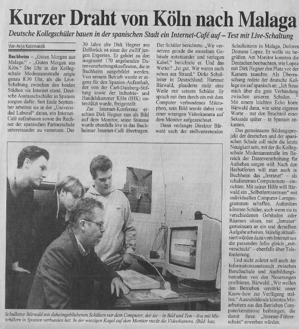 Mit dem Umstieg auf Windows NT kam auch gleichzeitig das Internet in die Schule. In unserer Schule bildete sich die erste Internet AG aus Schülern der damaligen Datenverarbeitungskaufleute. Mit dieser Truppe zeigte sich das EGB auch erstmalig in der Öffentlichkeit – 1996 besuchte eine DV-Klasse eine spanische Schule in Malaga und es gab die erste Videokonferenz mit den beiden Schulleitern. Im gleichen Jahr eröffnete das EGB das erste Internet-Cafe aller Kölner Schulen und wurde Mitglied im Microsoft-NT-Arbeitskreis.