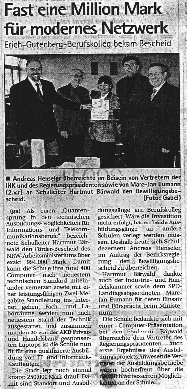 „Fast eine Million Mark für modernes Netzwerk“ – so lautete am 03.01 2001 eine Schlagzeile in der Presse. Das EGB bekam Dank der Unterstützung des damaligen SPD-Landtagsabgeordneten Marc-Jan Eumann knapp 1 Million DM vom Land NRW für die Modernisierung des EGB-Computernetzwerks.