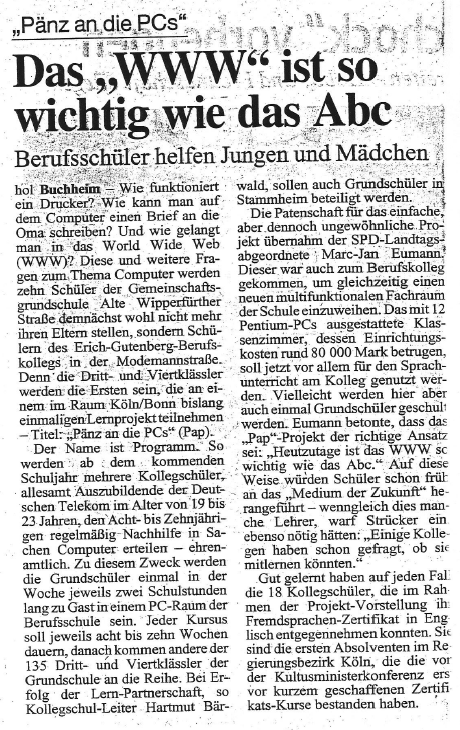 PAP – Pänz an die PCs – ein Projekt was in dieser Form bundesweit einmalig war und ist (Anlage7 und 8). Ab dem Jahr 1999 treffen sich Dritt- und Viertklässler der GGS Alte Wipperfürther Straße und IT-Auszubildende (Paten) des EGB einmal wöchentlich und erkunden gemeinsam den Computer und das Internet. Viele Auszeichnungen und Preise folgen – bis hin zur Einladung von Microsoft zur Eröffnung des STIC am 28. Juni 2011 in Köln. Das Projekt läuft immer noch und erfreut sich großer Beliebtheit bei allen Beteiligten.
