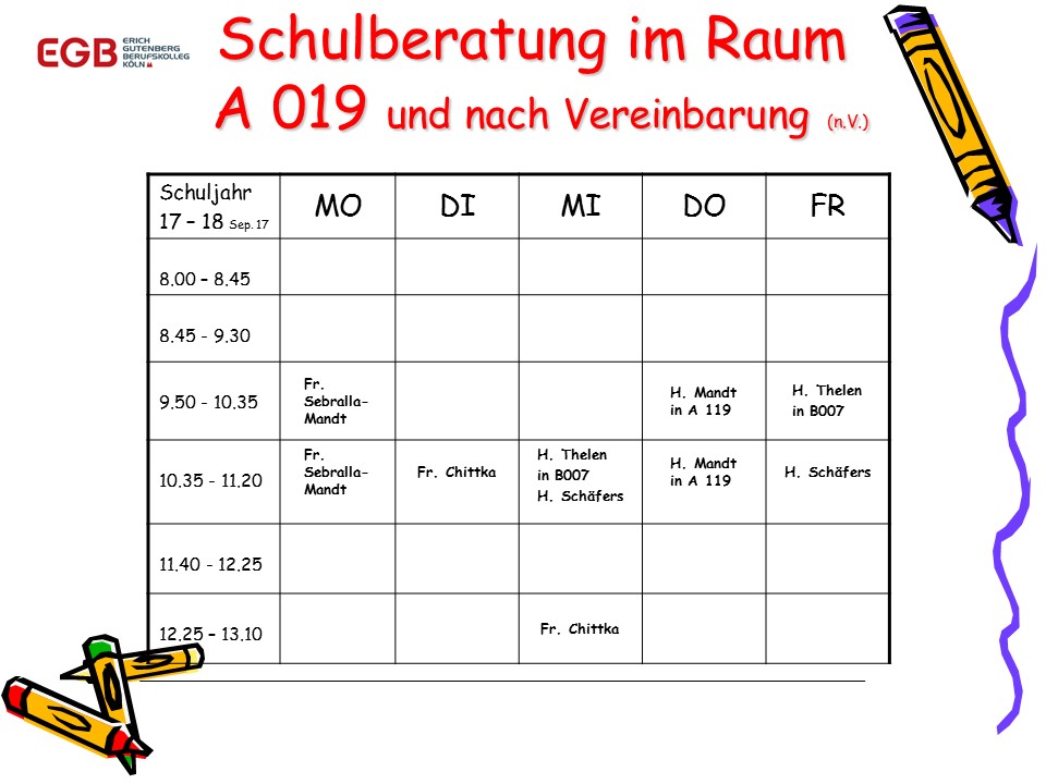 Die Sprechzeiten des Beratungslehrerteams: Frau Chittka, Frau Kirci, Herr Nover, Herr Schäfers, Herr Thelen
